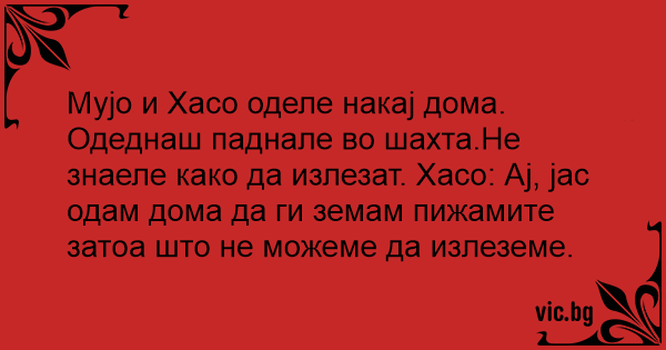 Одеднаш паднале во шахта.Не знаеле како да излезат. Хасо: Ај, јас одам дома да ги земам пижамите затоа што не можеме да излеземе.