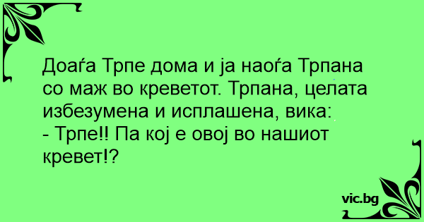Доаѓа Трпе дома и ја наоѓа Трпана со маж во креветот. Трпана, целата избезумена и исплашена, вика: