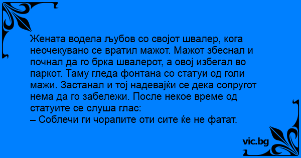 Жената водела љубов со својот швалер, кога неочекувано се вратил мажот. Мажот збеснал и почнал да го брка швалерот, а овој избегал во паркот. Таму гледа фонтана со статуи од голи мажи. Застанал и тој надевајќи се дека сопругот нема да го забележи. После некое време од статуите се слуша глас: