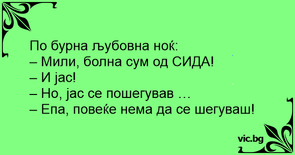Alkalmi pár a hotelszobában meghitten szeretkezik, amikor a szőke csaj megszólal: - Van egy kis gond. AIDS-es vagyok... Srác: - Én is... Csaj: - De én csak vicceltem... Srác: - Többet nem fogsz!