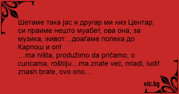 Шетаме така јас и другар ми низ Центар, си праиме нешто муабет, ова она, за музика, живот…доаѓаме полека до Карпош и оп!