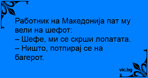 Градежниот работник му се јавува на шефот за да се оправда зошто работата не е завршена: – Шефе, ми се скрши лопатата! Шефот: – Ништо де, потпри се на багерот…