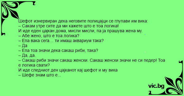 – Сакаш риби значи сакаш женски. Сакаш женски значи не си педер! Тоа е логика свати?