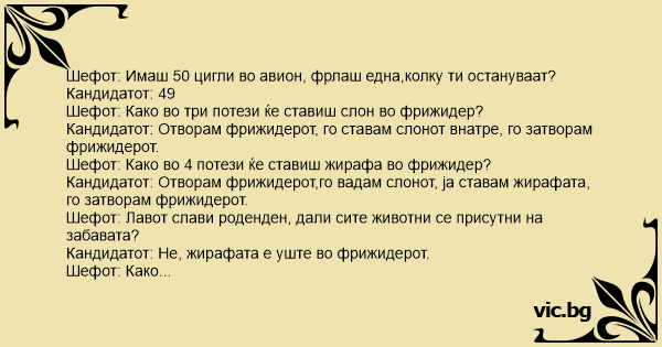 Кандидатот: Отворам фрижидерот,го вадам слонот, ја ставам жирафата, го затворам фрижидерот.