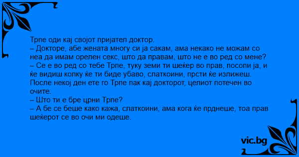– Докторе, абе жената многу си ја сакам, ама некако не можам со неа да имам орелен cekc, што да правам, што не е во ред со мене?
