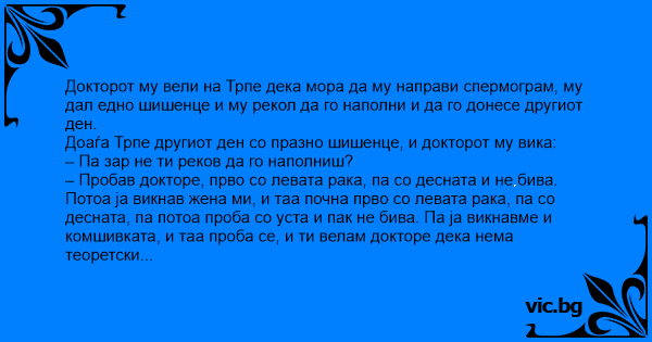 – Пробав докторе, прво со левата рака, па со десната и не бива. Потоа ја викнав жена ми, и таа почна прво со левата рака, па со десната, па потоа проба со уста и пак не бива. Па ја викнавме и комшивката, и таа проба се, и ти велам докторе дека нема теоретски шанси да го отвориме ова шишенце.