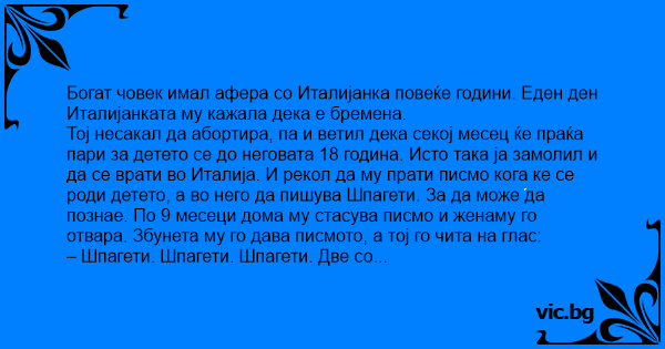Тој несакал да абортира, па и ветил дека секој месец ќе праќа пари за детето се до неговата 18 година. Исто така ја замолил и да се врати во Италија. И рекол да му прати писмо кога ке се роди детето, а во него да пишува Шпагети. За да може да познае. По 9 месеци дома му стасува писмо и женаму го отвара. Збунета му го дава писмото, а тој го чита на глас: