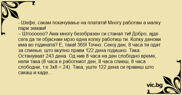 – Штоооооо? Ама многу безобразен си станал ти! Добро, ајде сега да ти објаснам мрзо една колку работиш ти. Колку денови има во годината? Е, така! 365! Точно. Секој ден, 8 часа ти одат за спиење, што вкупно прави 122 дена годишно. Така. Остануваат 243 дена. Од нив 8 часа на ден слободно време, нели така (8 часа е работниот ден, 8 часа спиеш, 8 часа слободни, т.е 3х8 = 24). Така, уште 122 дена си правиш што сакаш и каде сакаш. Остануваат 121 ден. Е сега, нели има 52 недели во годината! И во недела не работиме, нели? И колку дена остануваат? 69 денаааа. Така. Ми ја следиш ли мислата? Во петоците попладне се опуштате, нешто Мотика ова она – значи да ги сметаме петоците за пола работен ден, што значи 52 половинки, или уште 26 неработни денови. Кон тоа додаваме и по еден час сурфање после паузата за ручек секој ден, и што излегува? Уште 8 дена во годината сте зафатени со јадење пици, сендвичи и сурфање. Колку останаа? 35 дена. Ајде сега одземи ги тие 20 дена платен годишен одмор – остануваат 15 дена. А во Македонија, колку што знам јас има 15 државни празници. И што остана? Покачување! Аре бегај од тука не си го троши работното време за џабе!