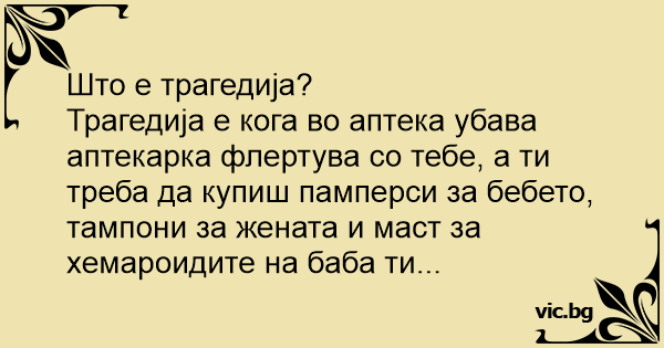Трагедија е кога во аптека убава аптекарка флертува со тебе, а ти треба да купиш памперси за бебето, тампони за жената и маст за хемароидите на баба ти...
