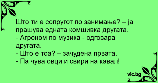 Што ти е сопругот по занимање? – ја прашува едната комшивка другата.