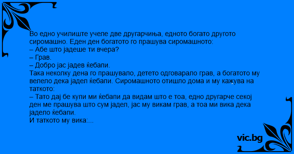Во едно училиште учеле две другарчиња, едното богато другото сиромашно. Еден ден богатото го прашува сиромашното:
