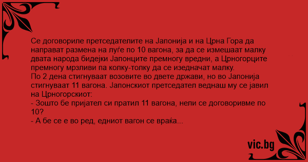 Се договориле претседателите на Јапонија и на Црна Гора да направат размена на луѓе по 10 вагона, за да се измешаат малку двата народа бидејки Јапонците премногу вредни, а Црногорците премногу мрзливи па колку-толку да се изедначат малку.