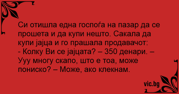 - Колку Ви се јајцата? – 350 денари. – Ууу многу скапо, што е тоа, може пониско? – Може, ако клекнам.