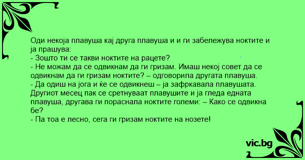 - Да одиш на јога и ќе се одвикнеш – ја зафркавала плавушата. Другиот месец пак се сретнуваат плавушите и ја гледа едната плавуша, другава ги пораснала ноктите големи: – Како се одвикна бе?