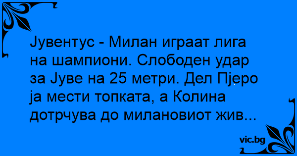 Јувентус - Милан играат лига на шампиони. Слободен удар за Јуве на 25 метри. Дел Пјеро ја мести топката, а Колина дотрчува до милановиот жив...