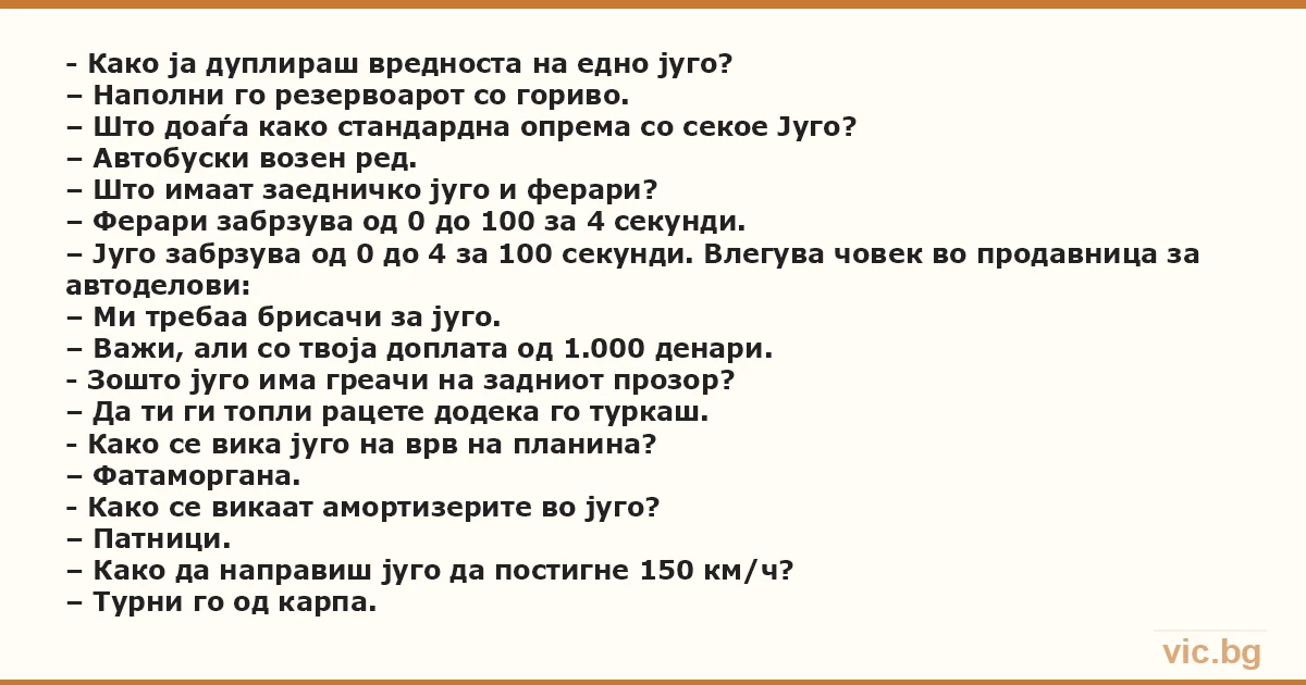 - Како ја дуплираш вредноста на едно југо? – Наполни го резервоарот со гориво. – Што доаѓа како стандардна опрема со секое Југо? – Автобуски возен ред. – Што имаат заедничко југо и ферари? – Ферари забрзува од 0 до 100 за 4 секунди. – Југо забрзува од 0 до 4 за 100 секунди. Влегува човек во продавница за автоделови: – Ми требаа брисачи за југо. – Важи, али со твоја доплата од 1.000 денари. - Зошто југо има греачи на задниот прозор? – Да ти ги топли рацете додека го туркаш. - Како се вика југо на врв на планина? – Фатаморгана. - Како се викаат амортизерите во југо? – Патници. – Како да направиш југо да постигне 150 км/ч? – Турни го од карпа.