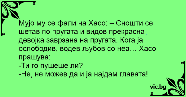 Мујо му се фали на Хасо: – Сношти се шетав по пругата и видов прекрасна девојка заврзана на пругата. Кога ја ослободив, водев љубов со неа… Хасо прашува: