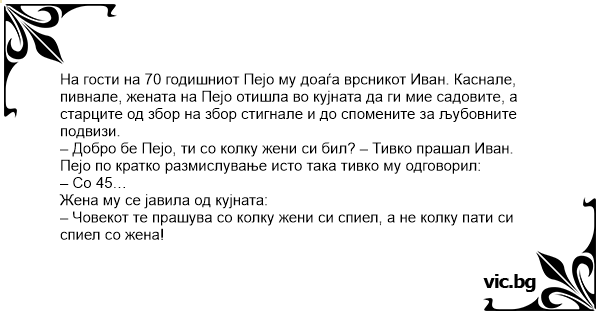 – Добро бе Пејо, ти со колку жени си бил? – Тивко прашал Иван.