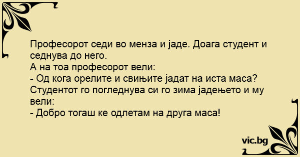 Професорот седи во менза и јаде. Доага студент и седнува до него.