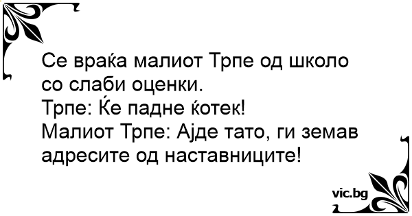 Се враќа малиот Трпе од школо со слаби оценки.
