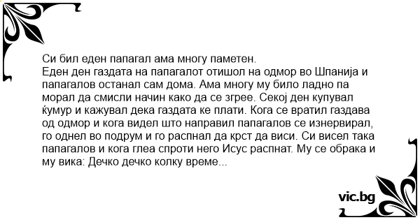 Еден ден газдата на папагалот отишол на одмор во Шпанија и папагалов останал сам дома. Ама многу му било ладно па морал да смисли начин како да се згрее. Секој ден купувал ќумур и кажувал дека газдата ке плати. Кога се вратил газдава од одмор и кога видел што направил папагалов се изнервирал, го однел во подрум и го распнал да крст да виси. Си висел така папагалов и кога глеа спроти него Исус распнат. Му се обрака и му вика: Дечко дечко колку време висиш овде бе? И Исус му рекол 2000 години. И папагалов:АИИИ ПА КОЛКУ ЌУМУР СИ КУПИЛ ТИ БЕЕЕ!!!!!