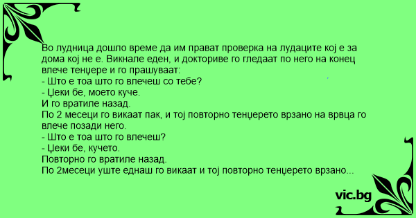 Во лудница дошло време да им прават проверка на лудаците кој е за дома кој не е. Викнале еден, и докториве го гледаат по него на конец влече тенџере и го прашуваат: