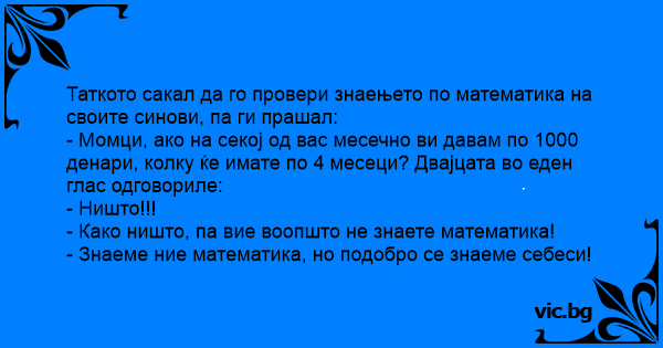 - Момци, ако на секој од вас месечно ви давам по 1000 денари, колку ќе имате по 4 месеци? Двајцата во еден глас одговориле: