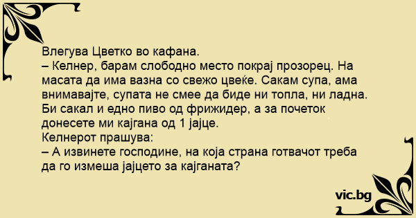– Келнер, барам слободно место покрај прозорец. На масата да има вазна со свежо цвеќе. Сакам супа, ама внимавајте, супата не смее да биде ни топла, ни ладна. Би сакал и едно пиво од фрижидер, а за почеток донесете ми кајгана од 1 јајце.