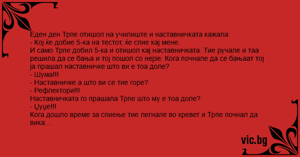 И само Трпе добил 5-ка и отишол кај наставничката. Тие ручале и таа решила да се бања и тој пошол со нејзе. Кога почнале да се бањаат тој ја прашал наставничке што ви е тоа доле?