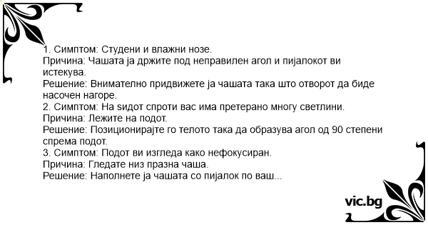 Причина: Чашата ја држите под неправилен агол и пијалокот ви истекува.