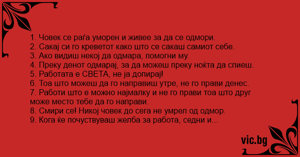 8. Смири се! Никој човек до сега не умрел од одмор.