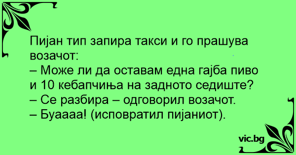 Пијан тип запира такси и го прашува возачот: