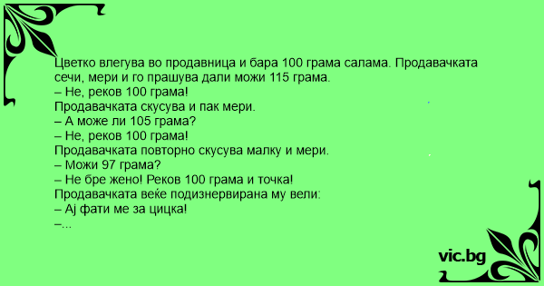 Цветко влегува во продавница и бара 100 грама салама. Продавачката сечи, мери и го прашува дали можи 115 грама.