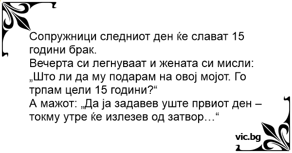 Вечерта си легнуваат и жената си мисли: „Што ли да му подарам на овој мојот. Го трпам цели 15 години?“
