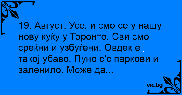 19. Август: Усели смо се у нашу нову куќу у Торонто. Сви смо среќни и узбуѓени. Овдек е такој убаво. Пуно с’с паркови и заленило. Може да...