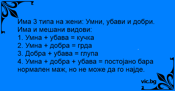 Има 3 типа на жени: Умни, убави и добри. Има и мешани видови: