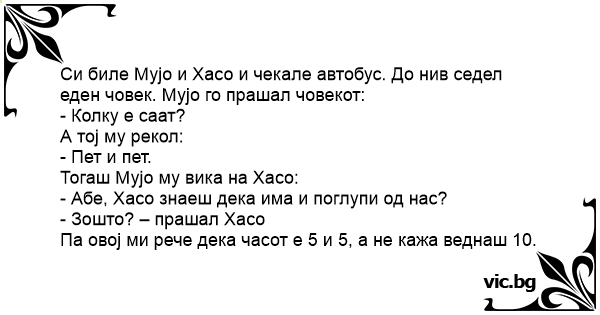 Си биле Мујо и Хасо и чекале автобус. До нив седел еден човек. Мујо го прашал човекот: