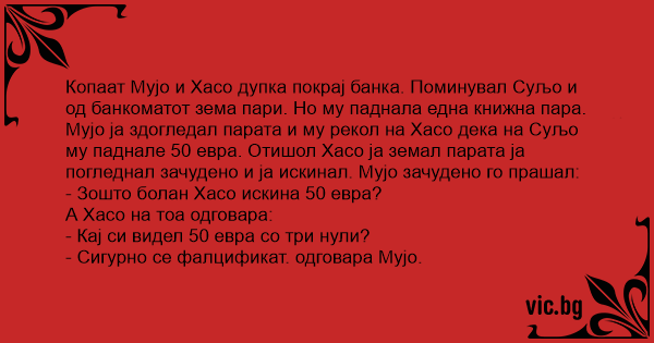 Копаат Мујо и Хасо дупка покрај банка. Поминувал Суљо и од банкоматот зема пари. Но му паднала една книжна пара. Мујо ја здогледал парата и му рекол на Хасо дека на Суљо му паднале 50 евра. Отишол Хасо ја земал парата ја погледнал зачудено и ја искинал. Мујо зачудено го прашал: