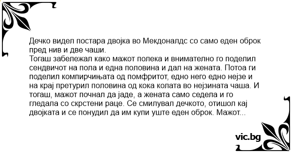 Тогаш забележал како мажот полека и внимателно го поделил сендвичот на пола и една половина и дал на жената. Потоа ги поделил компирчињата од помфритот, едно него едно нејзе и на крај претурил половина од кока колата во нејзината чаша. И тогаш, мажот почнал да јаде, а жената само седела и го гледала со скрстени раце. Се смилувал дечкото, отишол кај двојката и се понудил да им купи уште еден оброк. Мажот одговорил: