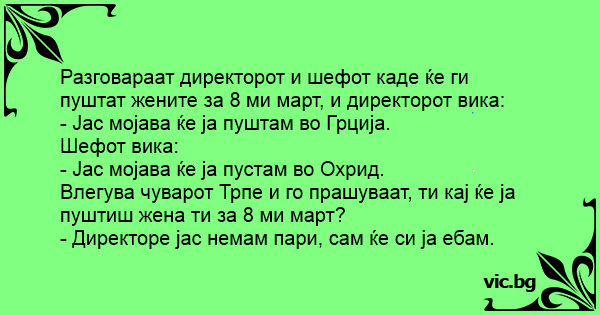 Разговараат директорот и шефот каде ќе ги пуштат жените за 8 ми март, и директорот вика: