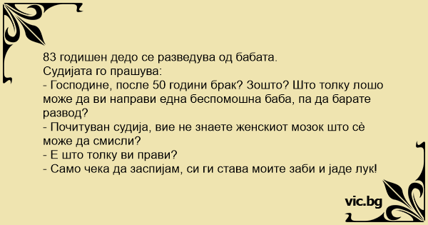 - Господине, после 50 години брак? Зошто? Што толку лошо може да ви направи една беспомошна баба, па да барате развод?