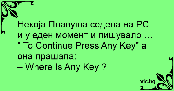 Некоја Плавуша седела на PC и у еден момент и пишувало … " To Continue Press Any Key" а она прашала:
