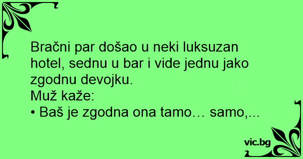 Bračni par došao u neki luksuzan hotel, sednu u bar i vide jednu jako zgodnu devojku.