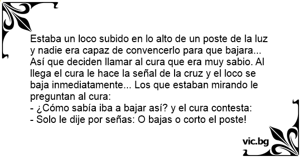 Así que deciden llamar al cura que era muy sabio. Al llega el cura le hace la señal de la cruz y el lосо se baja inmediatamente... Los que estaban mirando le preguntan al cura: