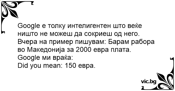 Google е толку интелигентен што веќе ништо не можеш да сокриеш од него. Вчера на пример пишувам: Барам рабора во Македонија за 2000 евра плата.