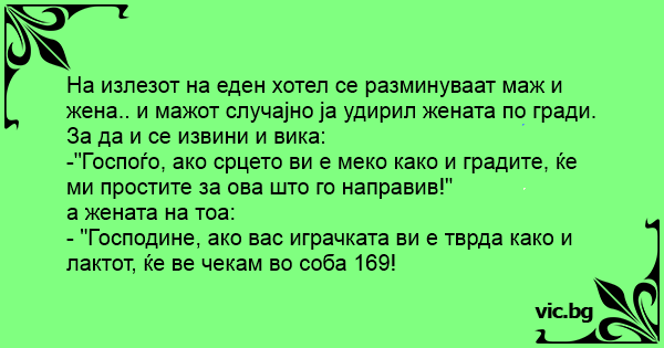 В асансьор на хотел без да иска мъж удря с лакът в гърдите млада дама. - Ох, извинете! Ако сърцето ви е толкова меко и топло колкото гърдите ви, ще ми простите... - Ако онази ви работа е толкова твърда, колкото и лакътя ви, то тогава сте поканен в моята стая - номер 324... - му отговаря тя.