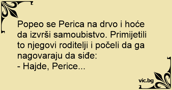 Popeo se Perica na drvo i hoće da izvrši samoubistvo. Primijetili to njegovi roditelji i počeli da ga nagovaraju da siđe: