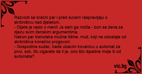 Razvodi se bračni par i pred sucem raspravljaju o skrbništvu nаd djetetom.
