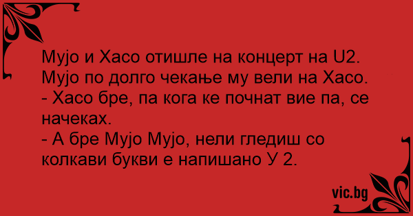 Мујо и Хасо отишле на концерт на U2. Мујо по долго чекање му вели на Хасо.