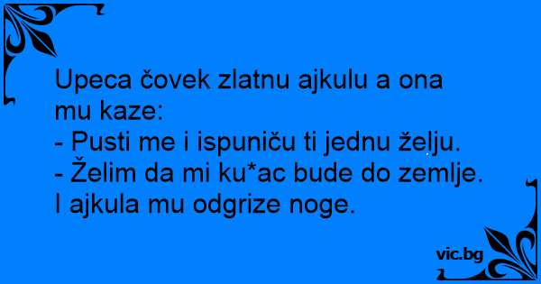 Upeca covek zlatnu ajkulu a ona mu kaze: ''Pusti me i ispunicu ti jednu zelju'' ''Zelim da mi ku... bude do zemlje'' I ajkula mu odgrize noge.